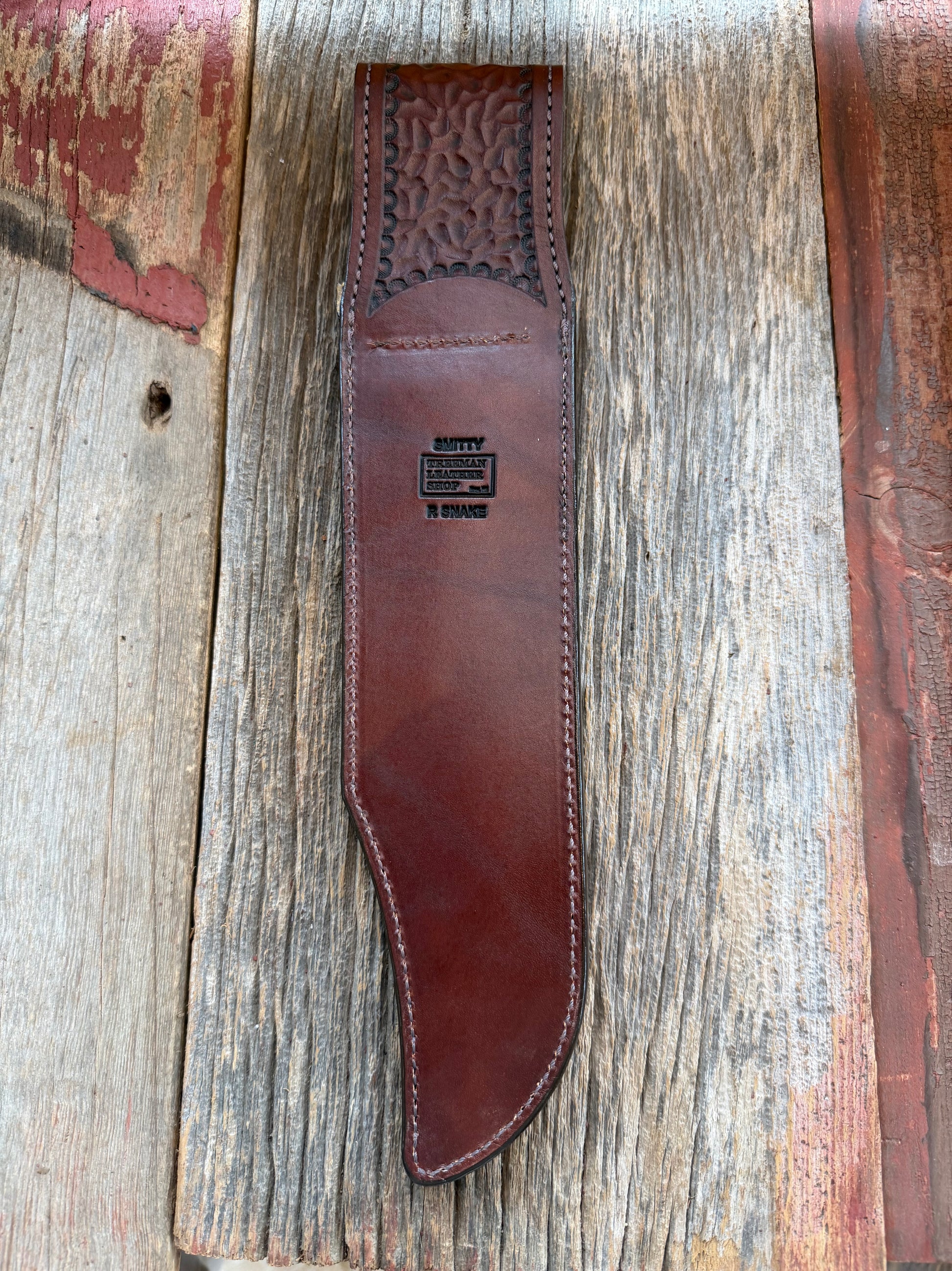 This is a small batch of Eastern Diamondback Rattlesnake sheaths. It is a very distinctive and vibrant pattern. This one fits a Randall model 12-11 knife. It has a unique texture color and pattern. Snake skins that are tanned properly and not paper thin and delicate are not easy to come. Very clean sheath with a border around the edges.