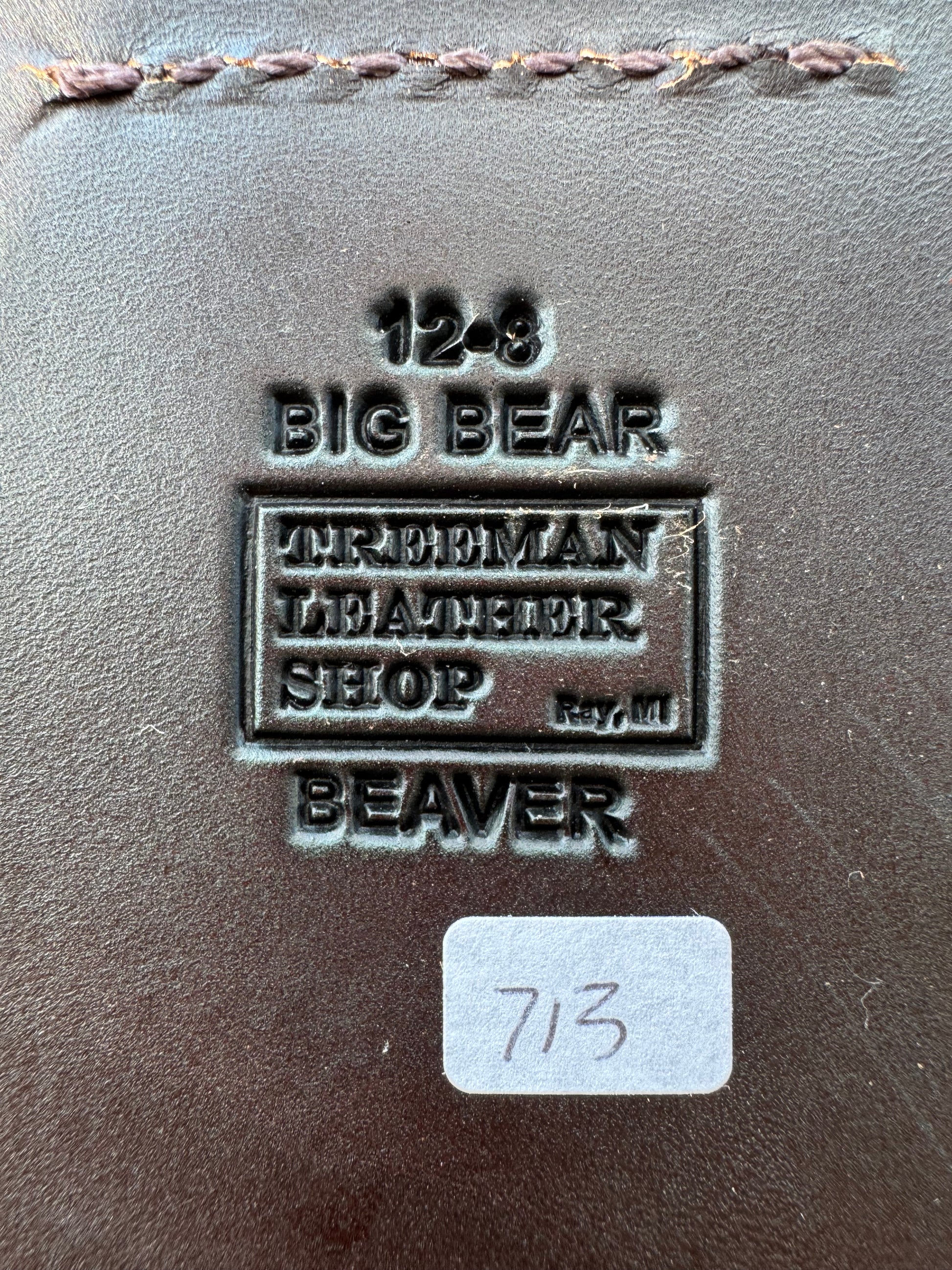 Brian’s most recent batch of Beaver sheaths turned out exceptional. All brass stamping on the back with a Treeman logo inside the square giving it a clean organized look. Hand tooled belt loops front and back.