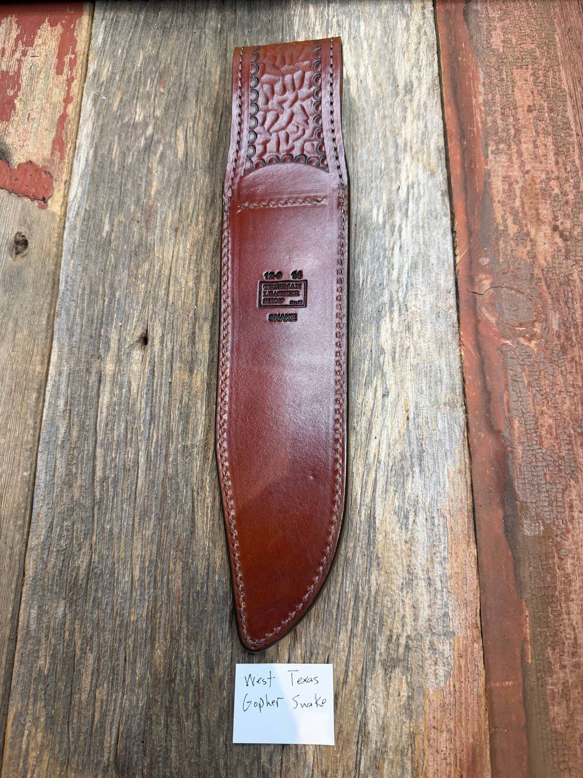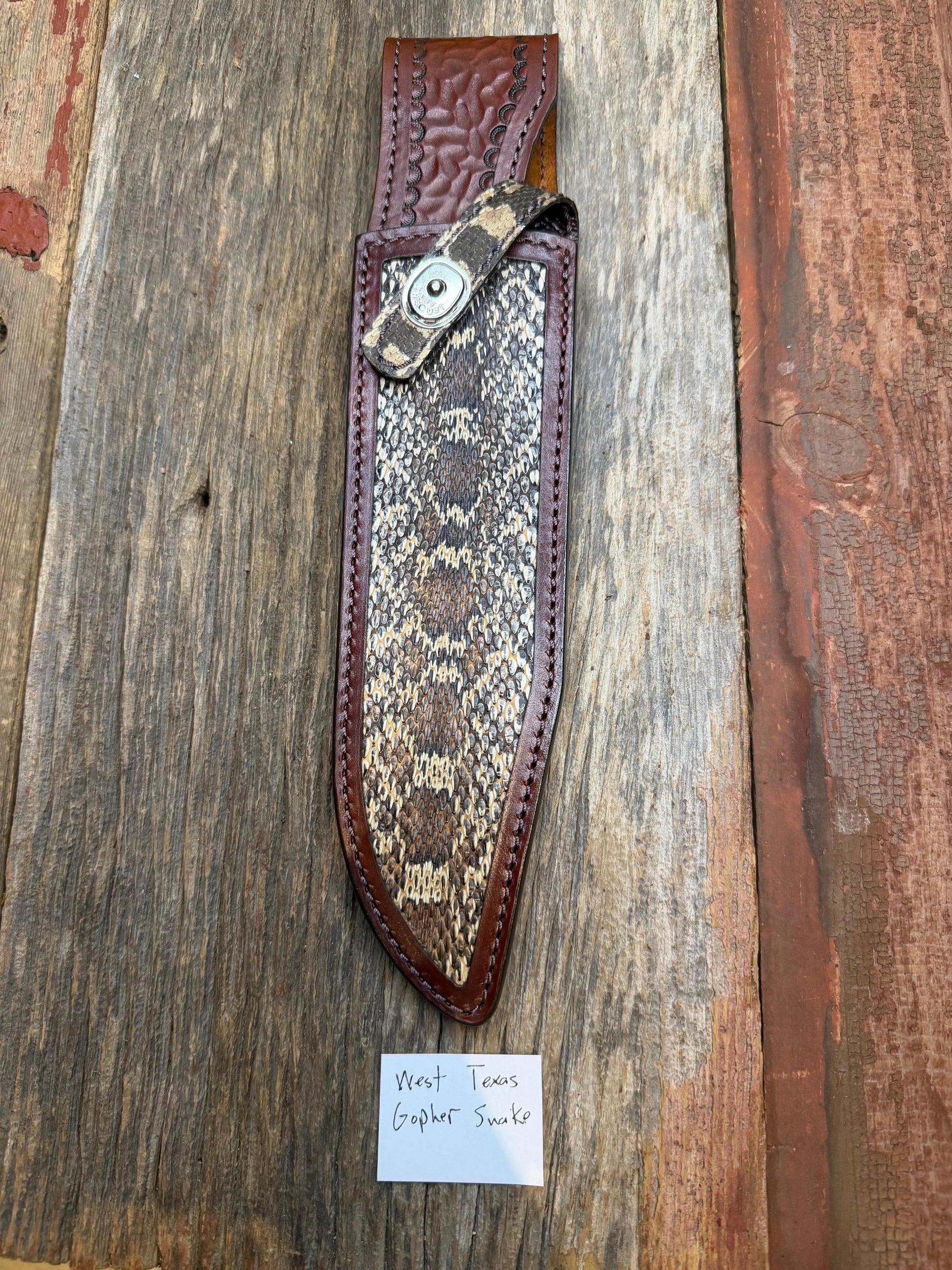 A small batch of sheaths from West Texas yellow Gopher Snake. It is a very distinctive and vibrant pattern. Fits a Randall model 12-9. It has a unique texture color and pattern. Snake skins that are tanned properly and not paper thin and delicate are not easy to come. Very clean sheath with a border around the edges.