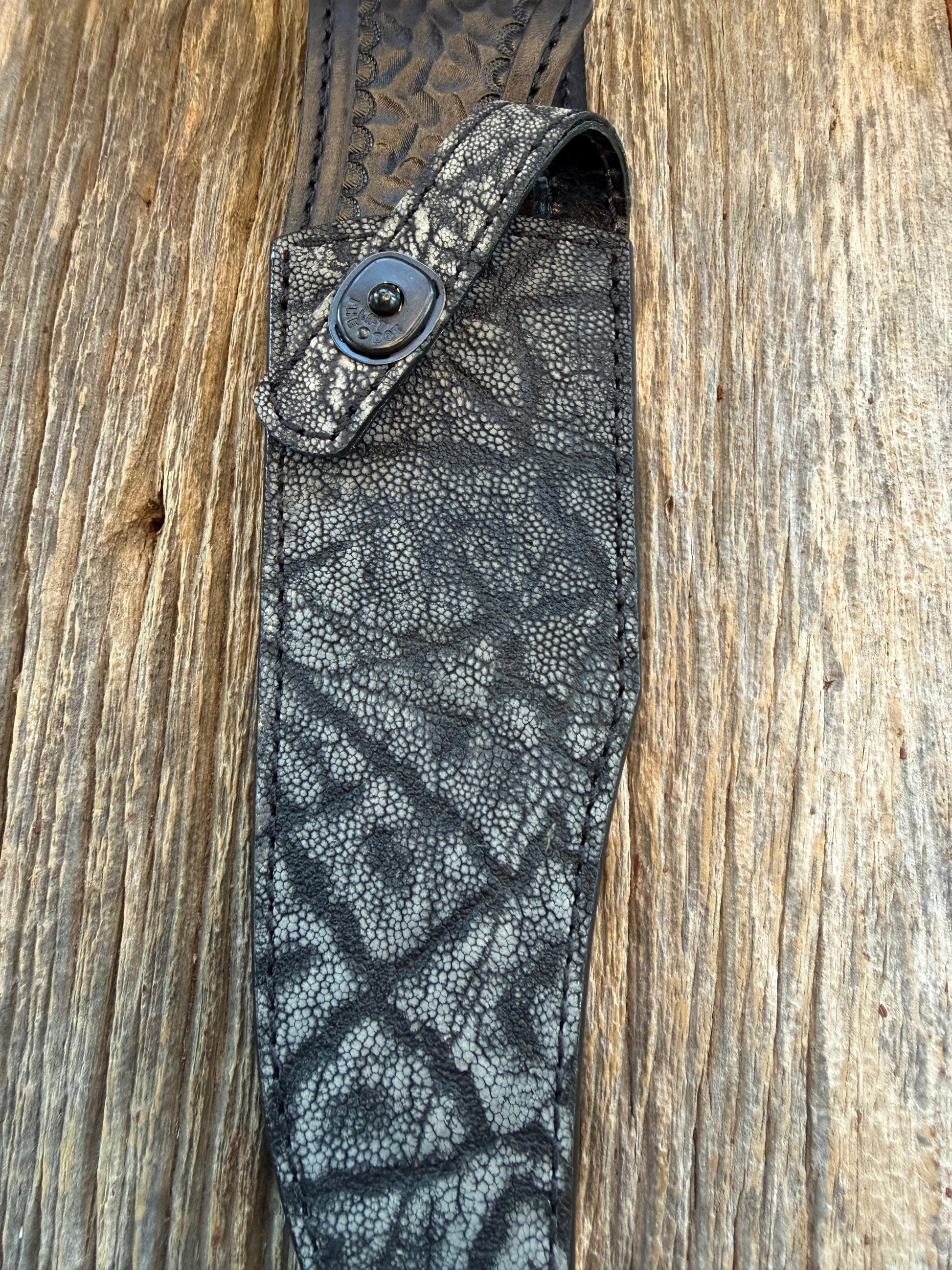 Randall Model 12-8 Sheath in Exotic African Elephant Ear from Treeman Sheaths. Black and Grey pebble texture and the new black Canteen snap, phenomenal.