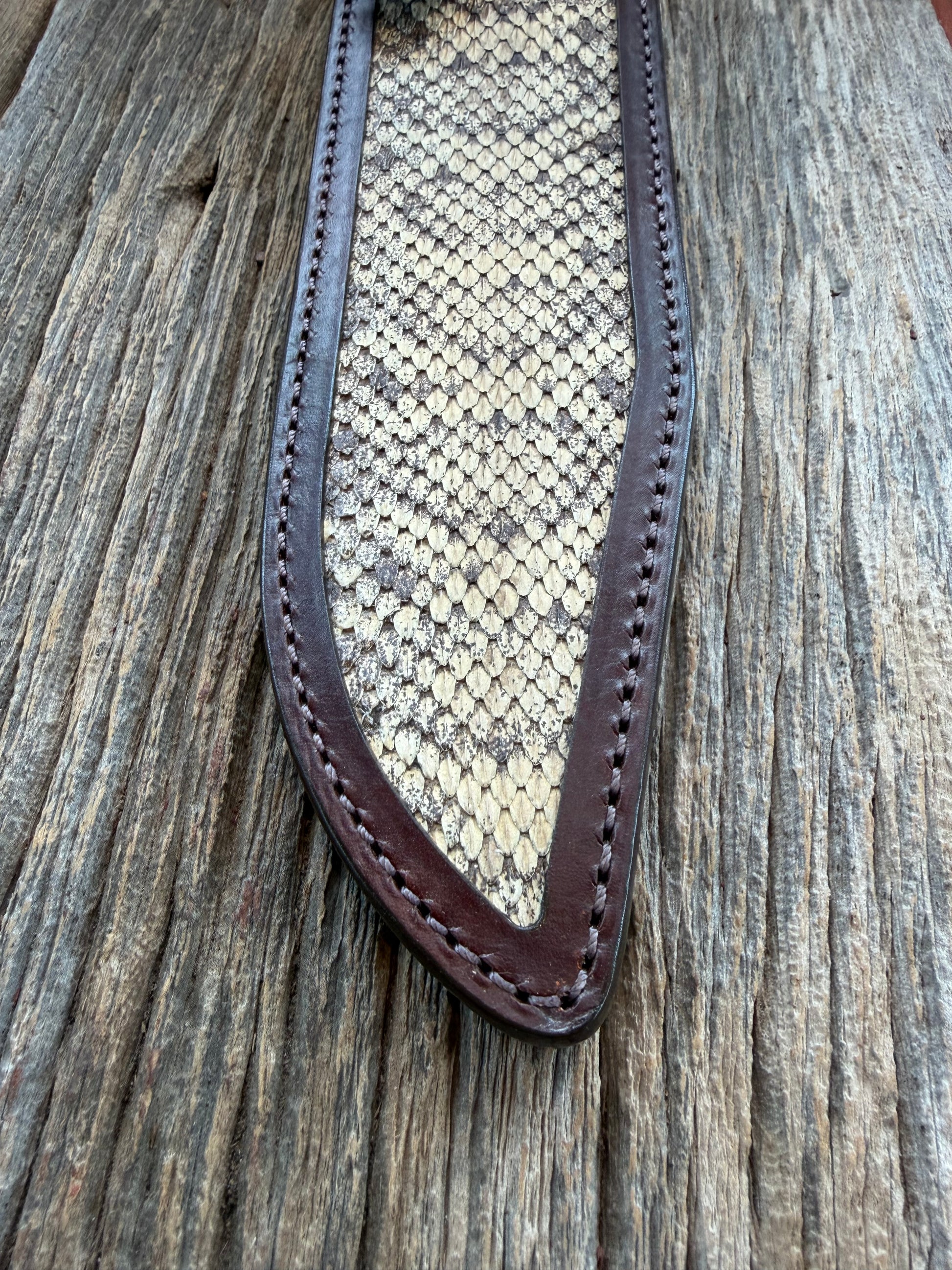 This is a small batch of Eastern Diamondback Rattlesnake sheaths. It is a very distinctive and vibrant pattern. This one fits a Randall model 12-9 knife. It has a unique texture color and pattern. Snake skins that are tanned properly and not paper thin and delicate are not easy to come. Very clean sheath with a border around the edges.