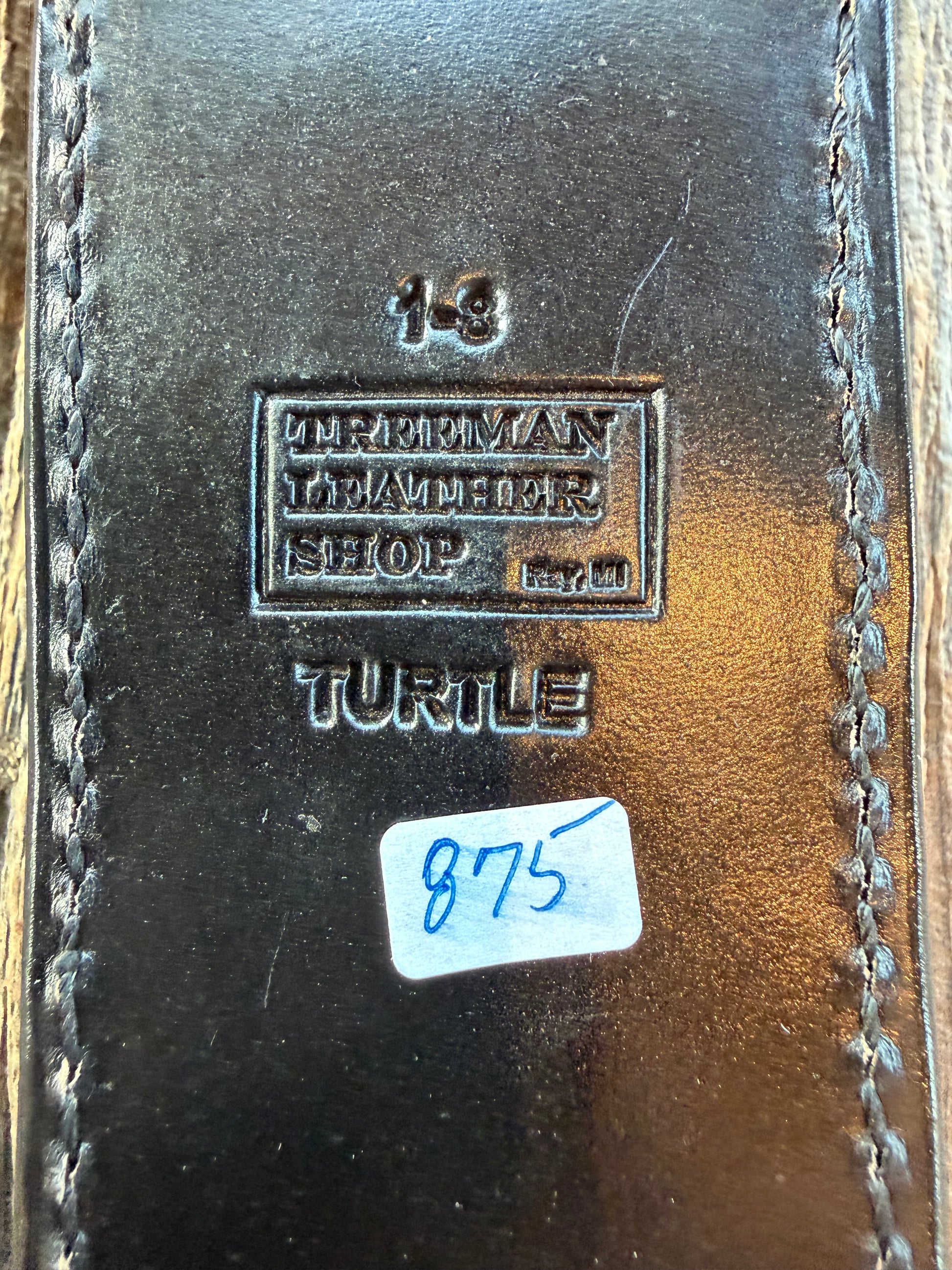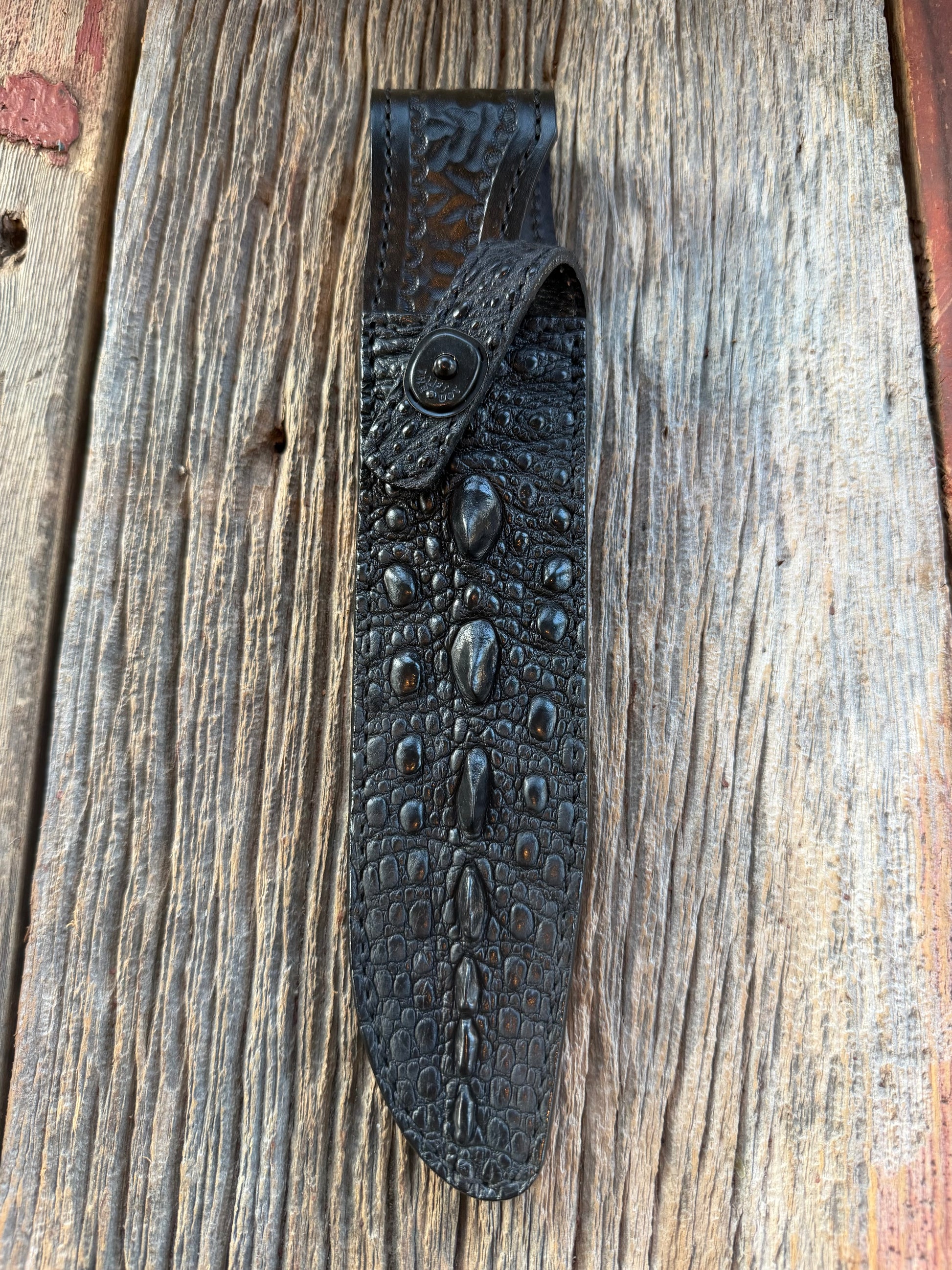 This is a killer Treeman sheath in an exotic Black Snapping turtle skin for a model 1-8. Big horned spikes and unique texture color and pattern. The latest from Rocco with brass stamping on the back and Treeman logo inside a square providing a clean organized look. Newest version with Black Canteen snaps.