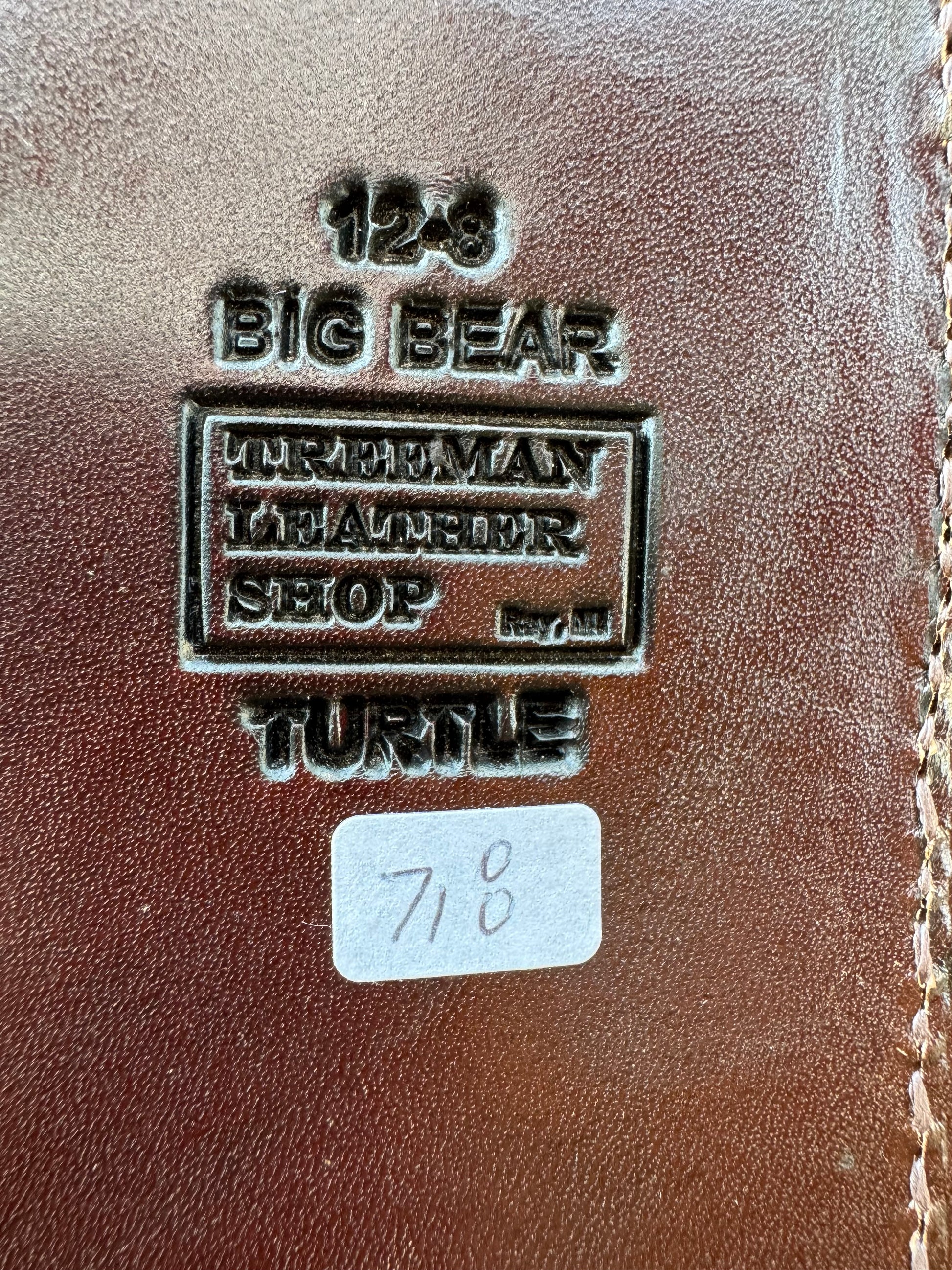 Brian’s most recent batch of Snapping Turtle sheaths turned out exceptional. All brass stamping on the back with a Treeman logo inside the square giving it a clean organized look. Hand tooled belt loops front and back.