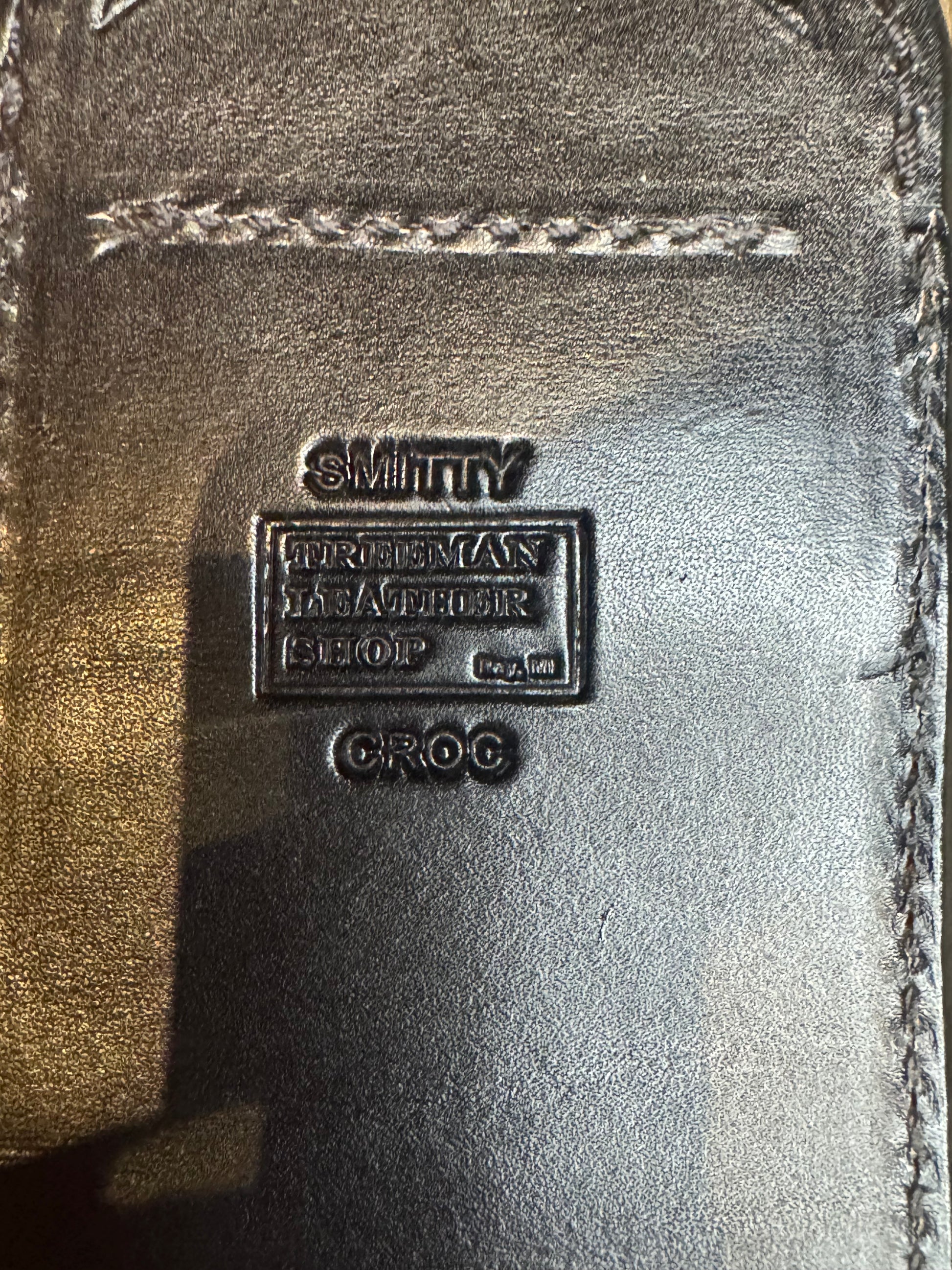 This is a nice Treeman sheath in black and white crocodile skin for a model 12-11 Smithsonian. It has a unique texture color and pattern. The latest from Rocco with brass stamping on the back and Treeman logo inside a square providing a clean organized look. One scale has been chipped hence the low cost.