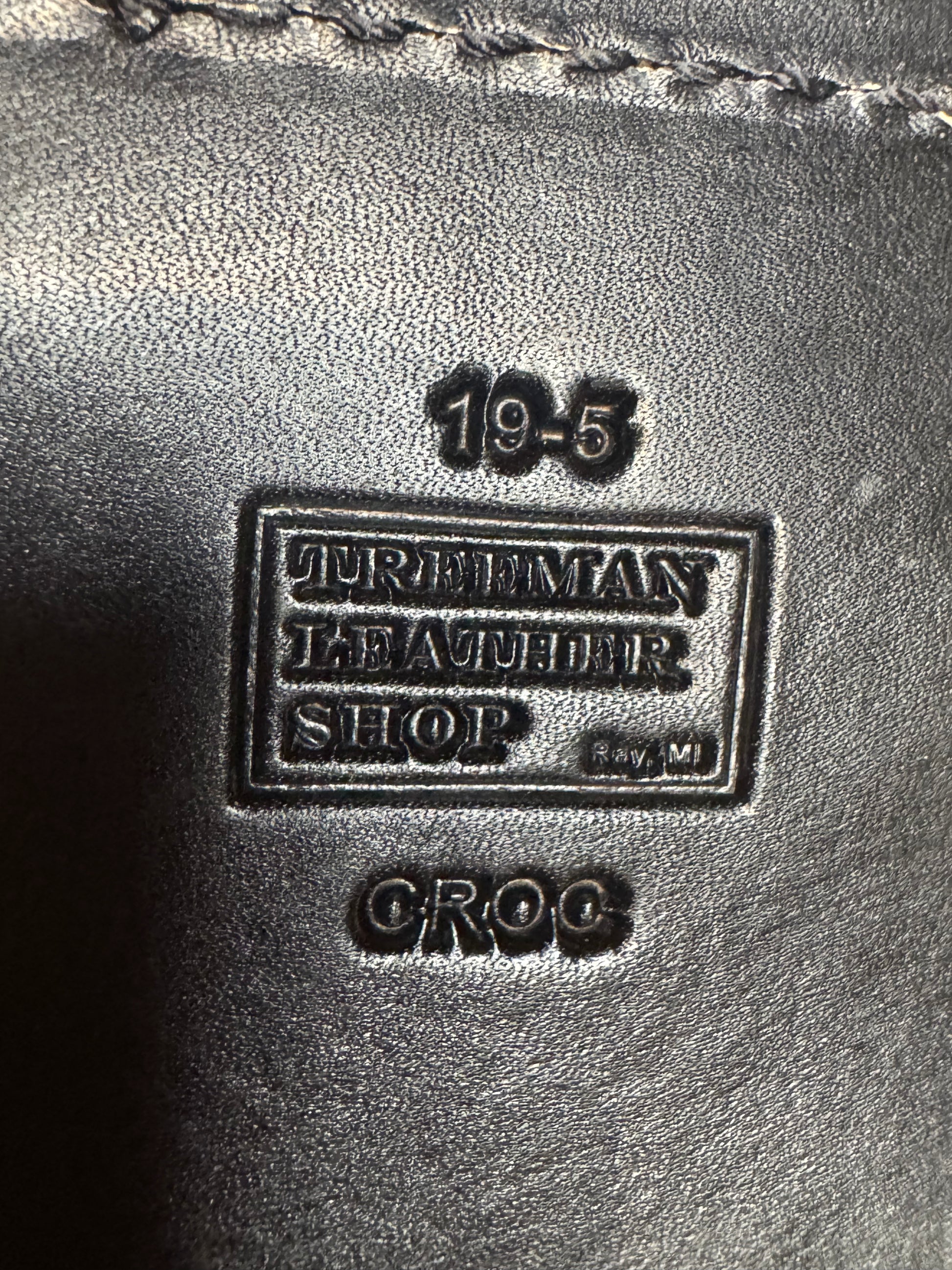 This is a nice Treeman sheath in black and white crocodile skin for a model 19-5. It has a unique texture color and pattern. The latest from Rocco with brass stamping on the back and Treeman  logo inside a square providing a clean organized look.