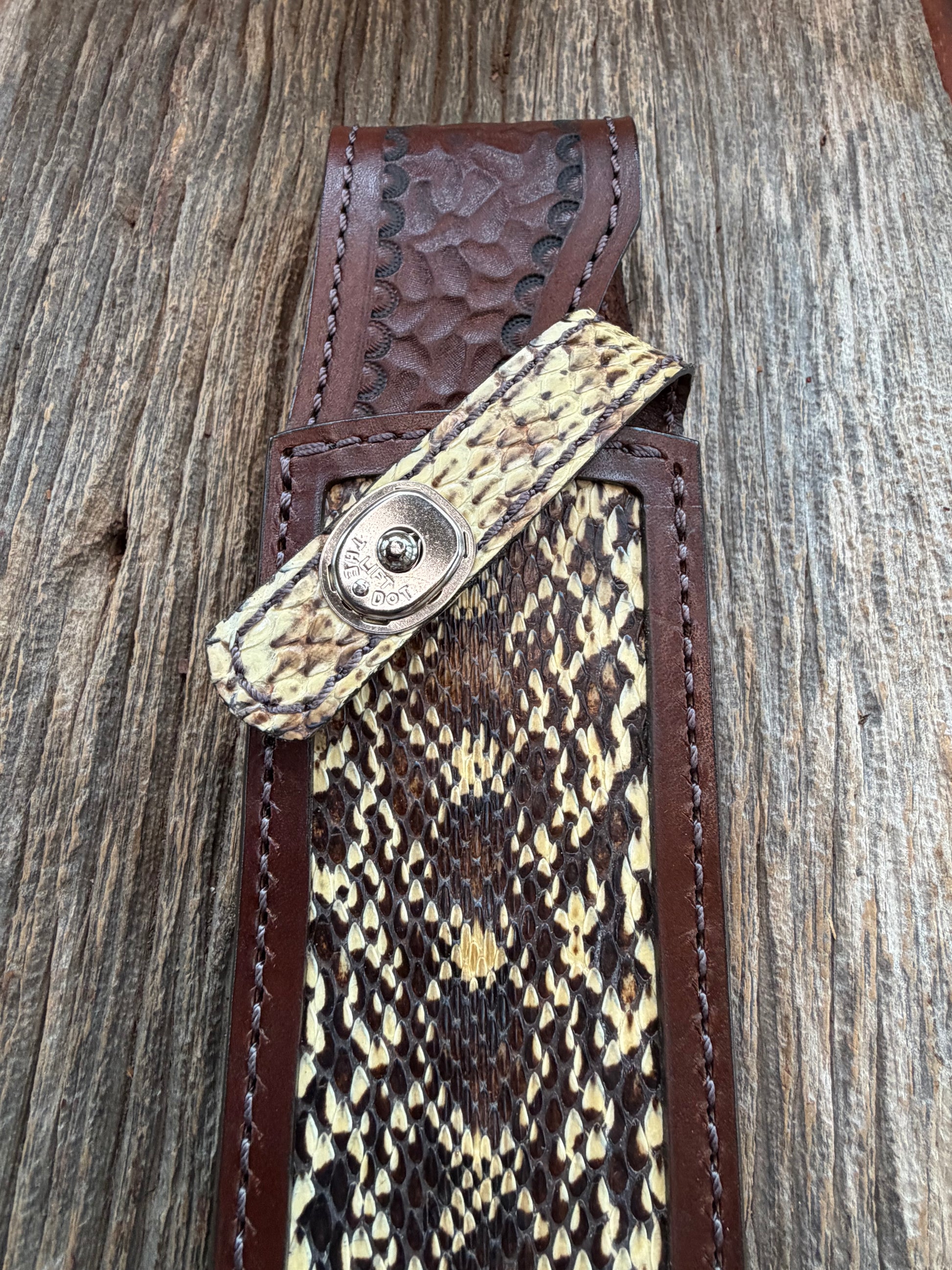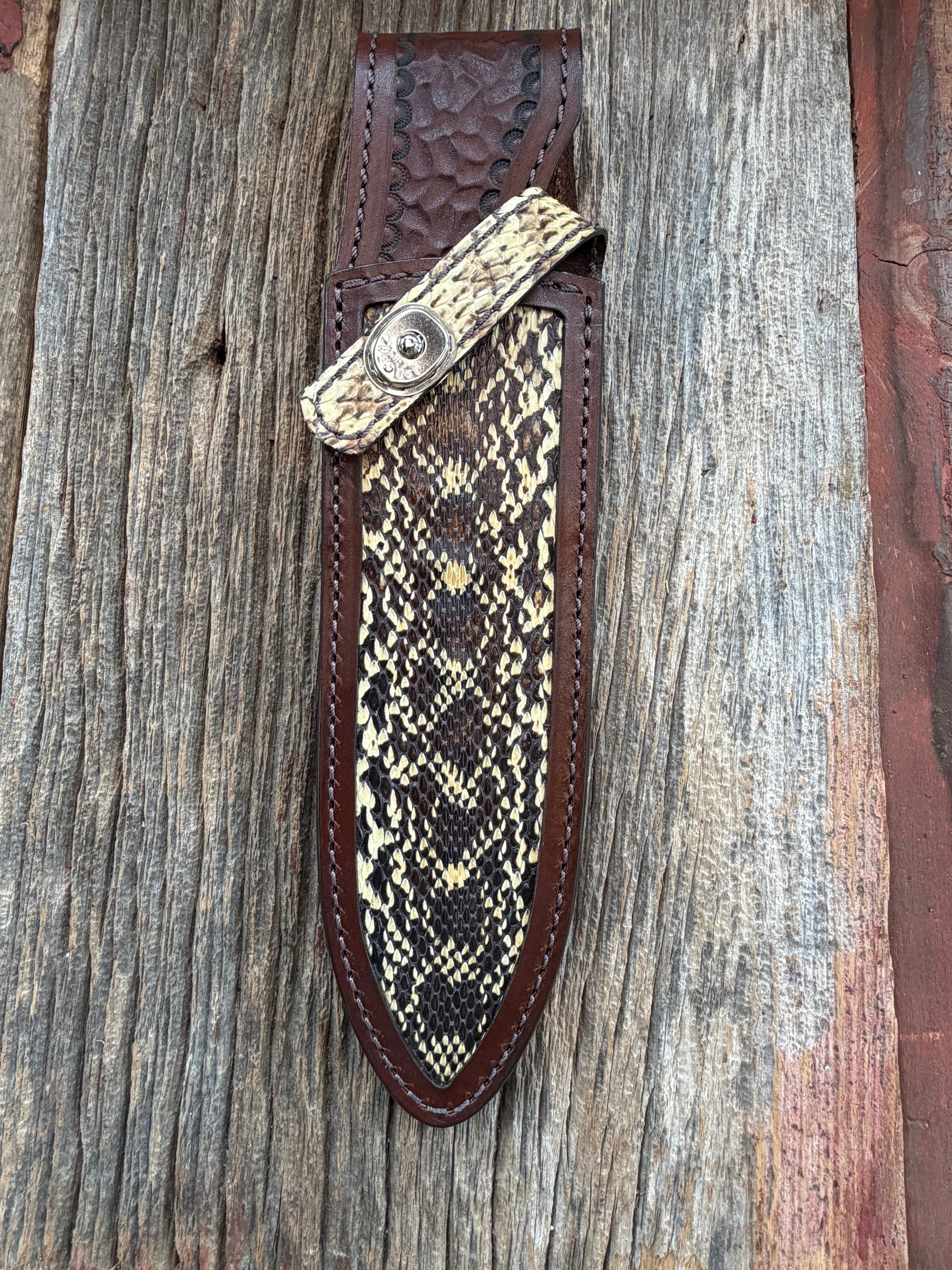 This is the only batch of sheaths from West Texas yellow Gopher Snake that I have made. It is a very distinctive and vibrant pattern. Fits a Randall model Clinton Special. It has a unique texture color and pattern. Snake skins that are tanned properly and not paper thin and delicate are not easy to come. Very clean sheath with a border around the edges.