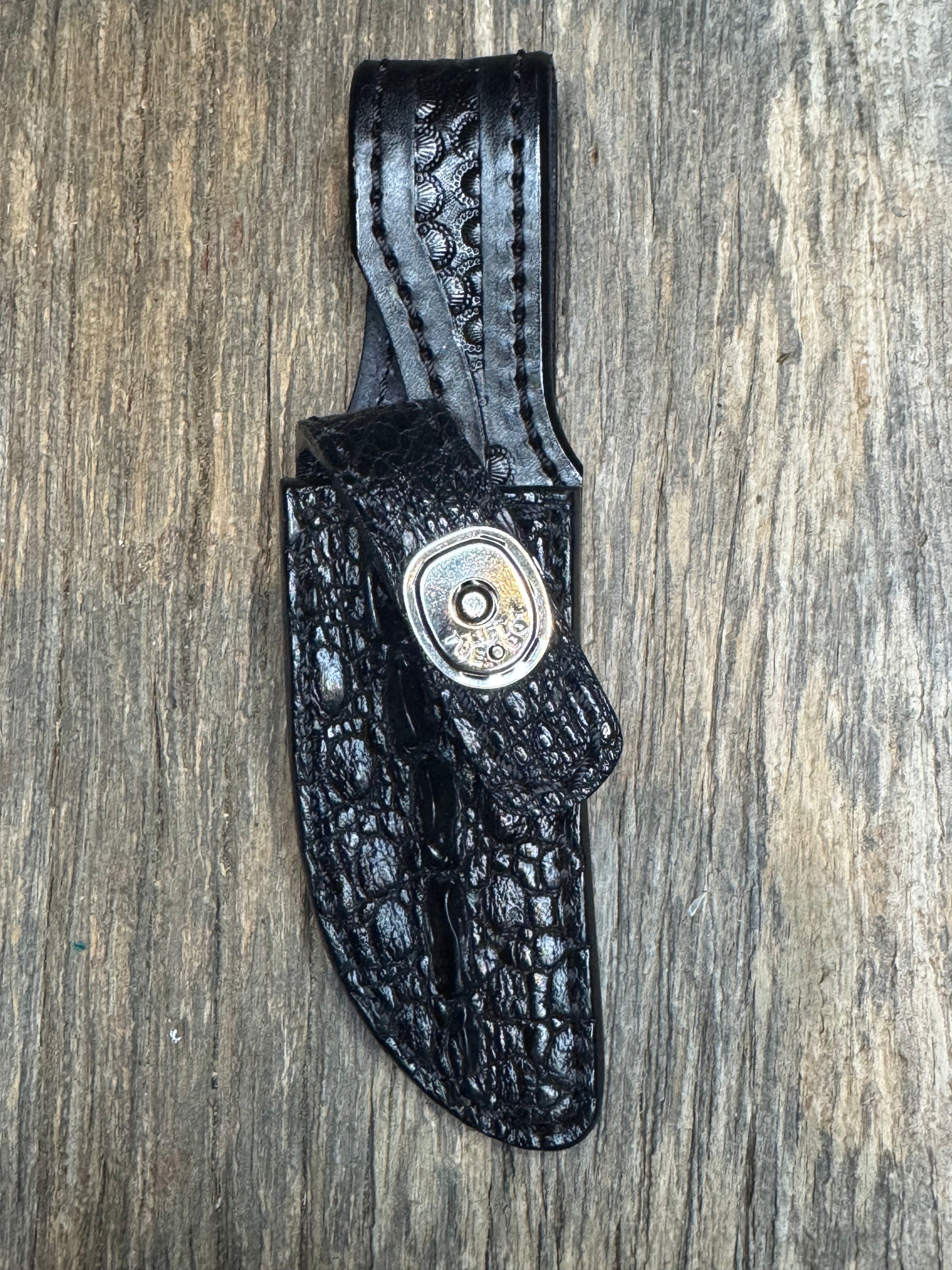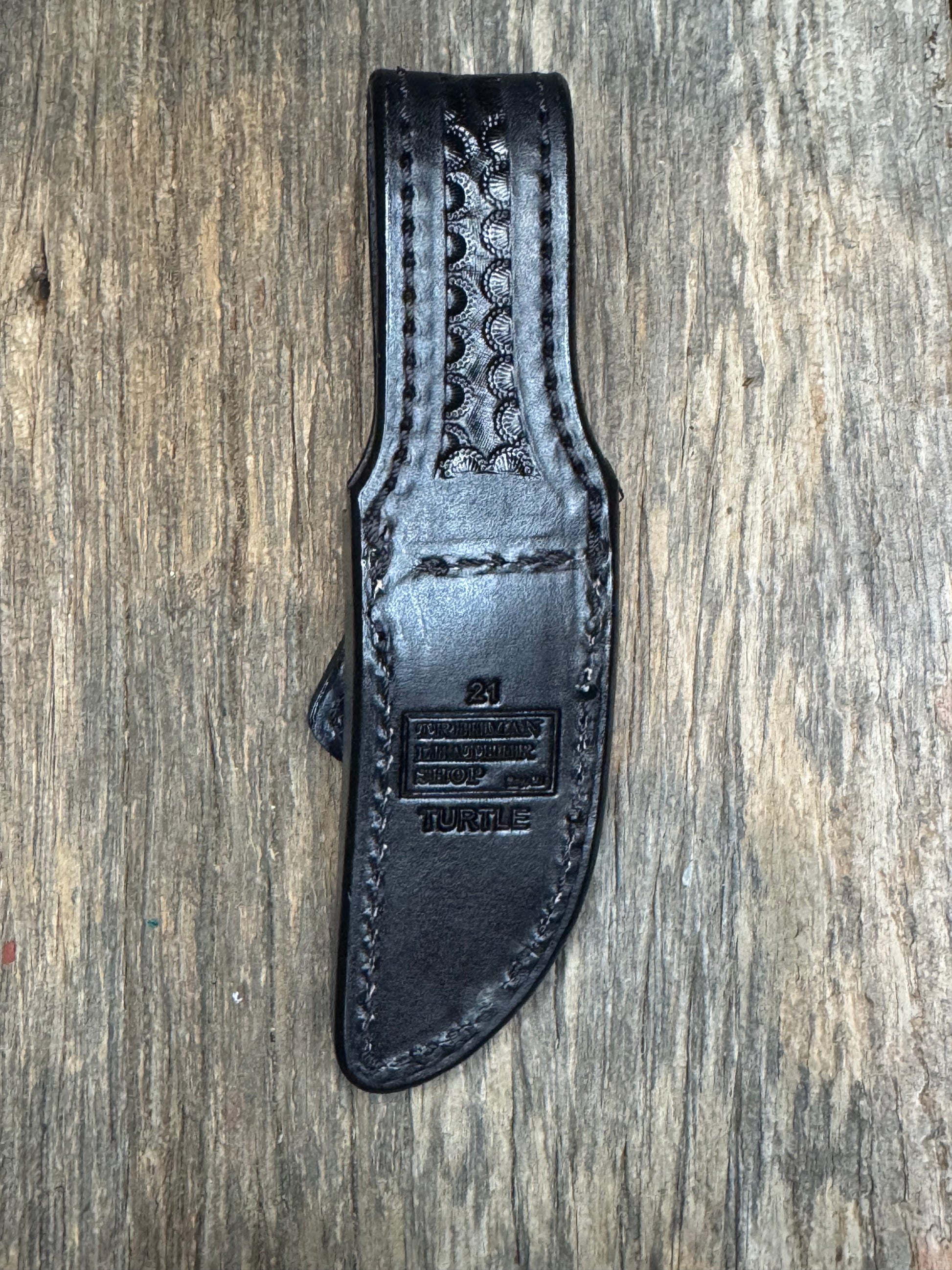 This is a nice Treeman sheath in Black Snapping Turtle for a model 21. It has a unique texture color and pattern. The latest from Rocco with brass stamping on the back and Treeman logo inside a square providing a clean organized look.