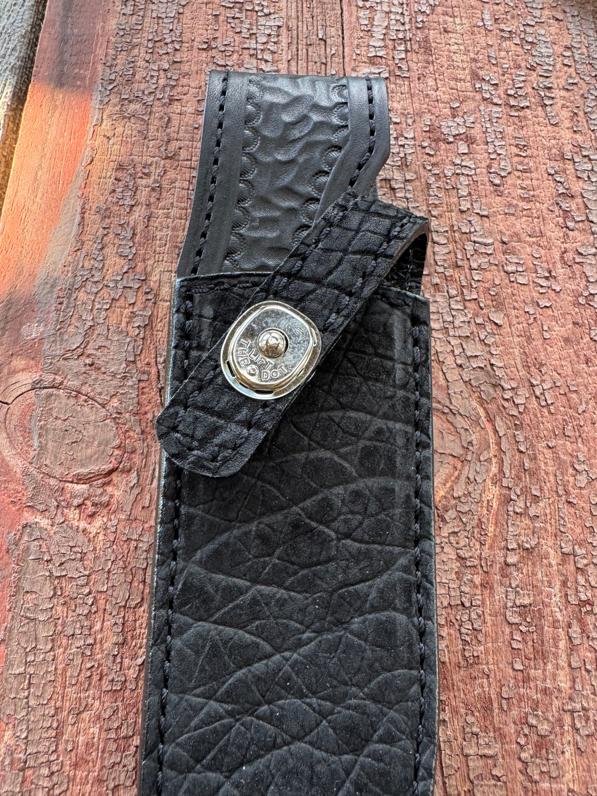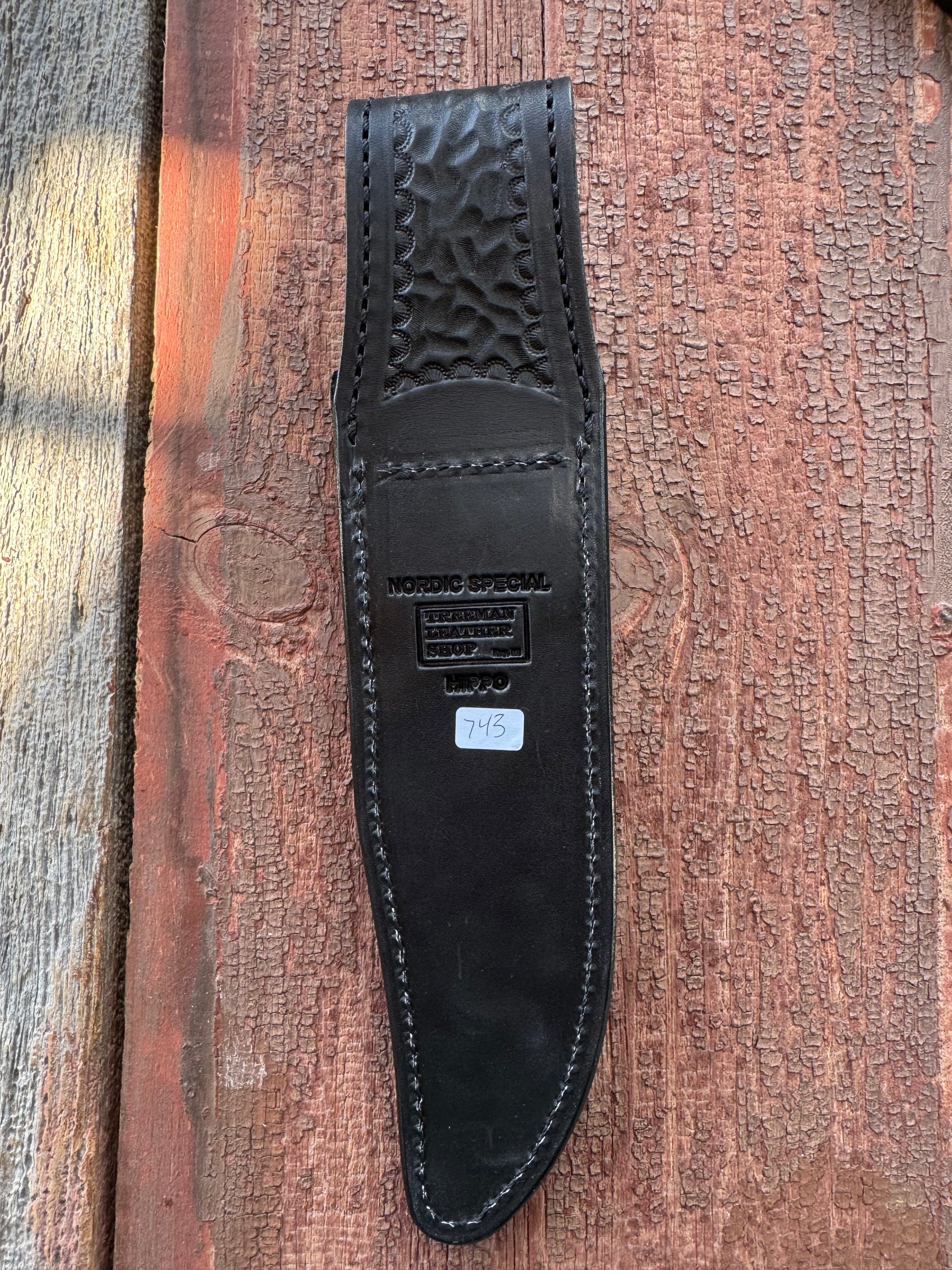 Brian’s most recent batch of Hippo sheaths turned out exceptional. All brass stamping on the back with a Treeman logo inside the square giving it a clean organized look. Hand tooled belt loops front and back.