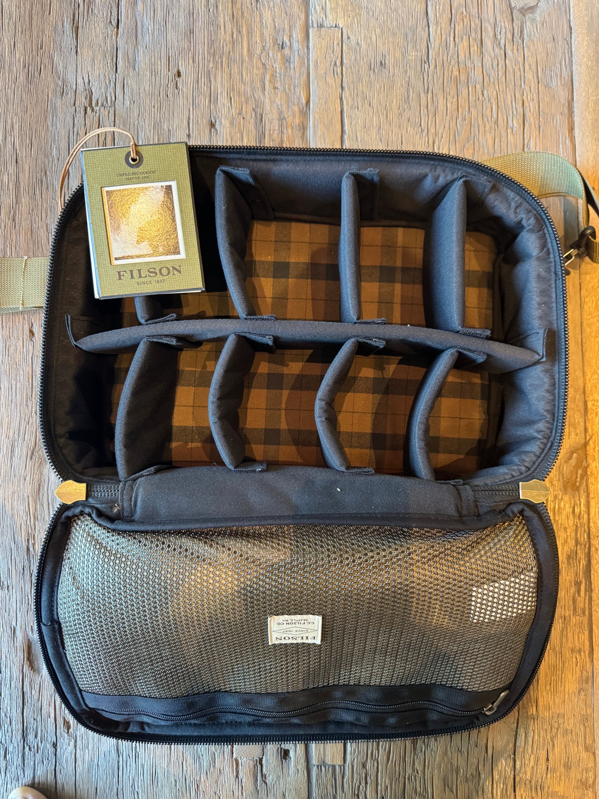 Whether you're traveling with a camera or fly fishing the Filson Compartment Case is for you. This dark tan case was created for anglers traveling with multiple fishing reels, but has a fully customizable interior with removable, adjustable dividers. Traveling with lots of camera equipment? This padded case will keep it safe when you're out in the brush and rain.