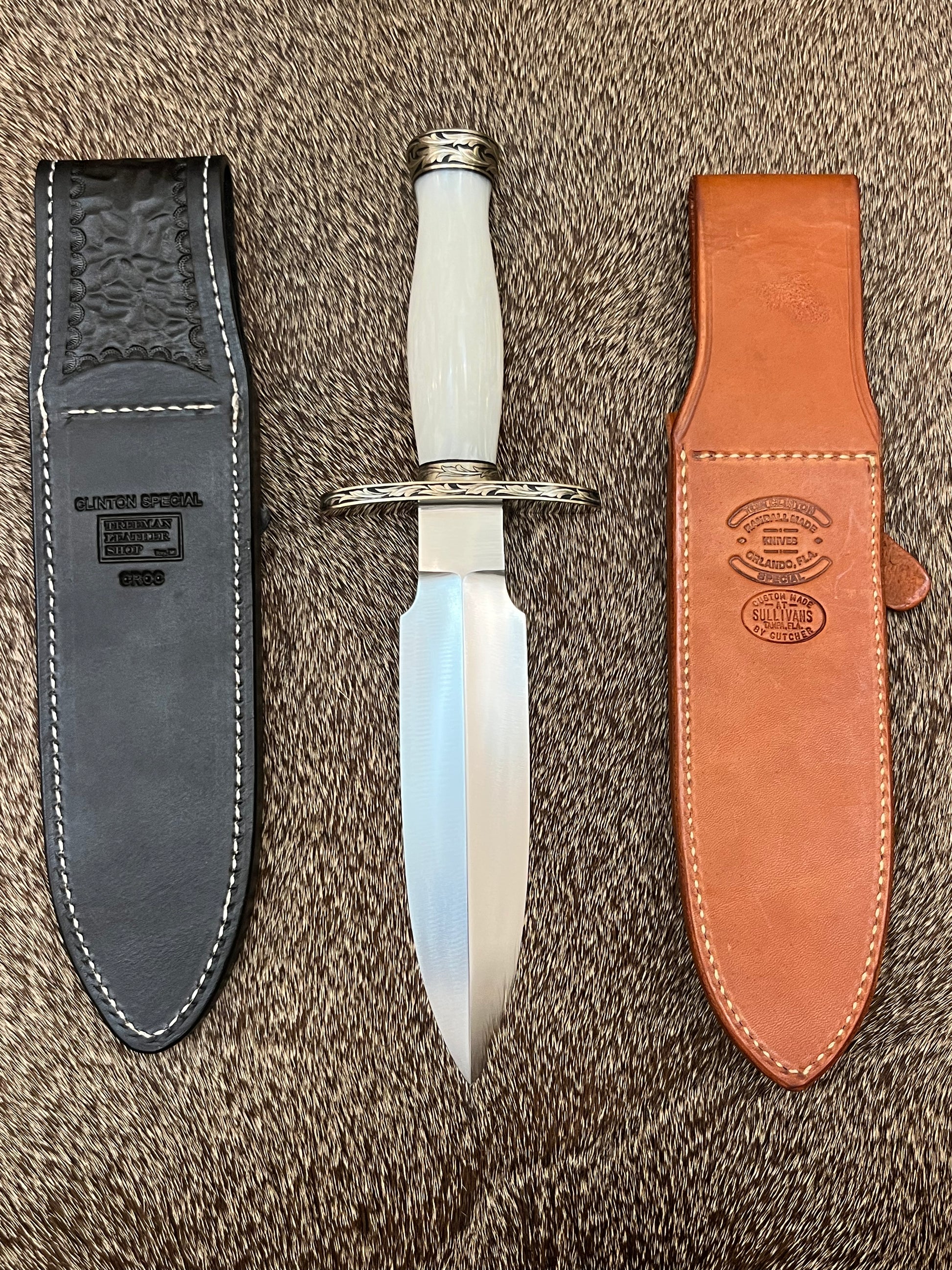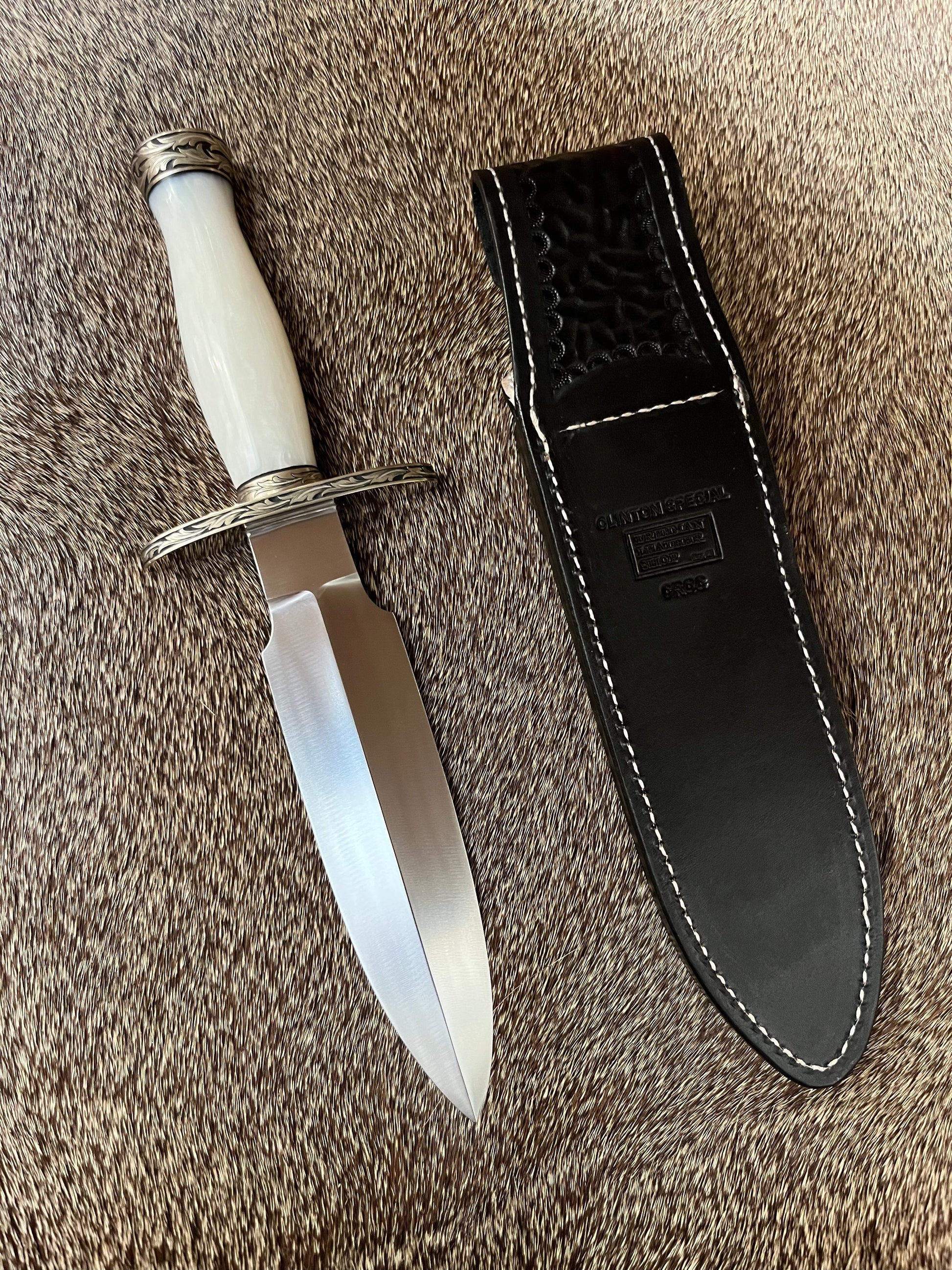 Comes with the Original Brown Leather Sheath with Salmon Sharpening Stone, made by Sullivan’s Custom Leather Shop, also comes with a Custom White Crock Sheath made by Treeman Leather Shop and a Custom TC Special Zipper Pouch