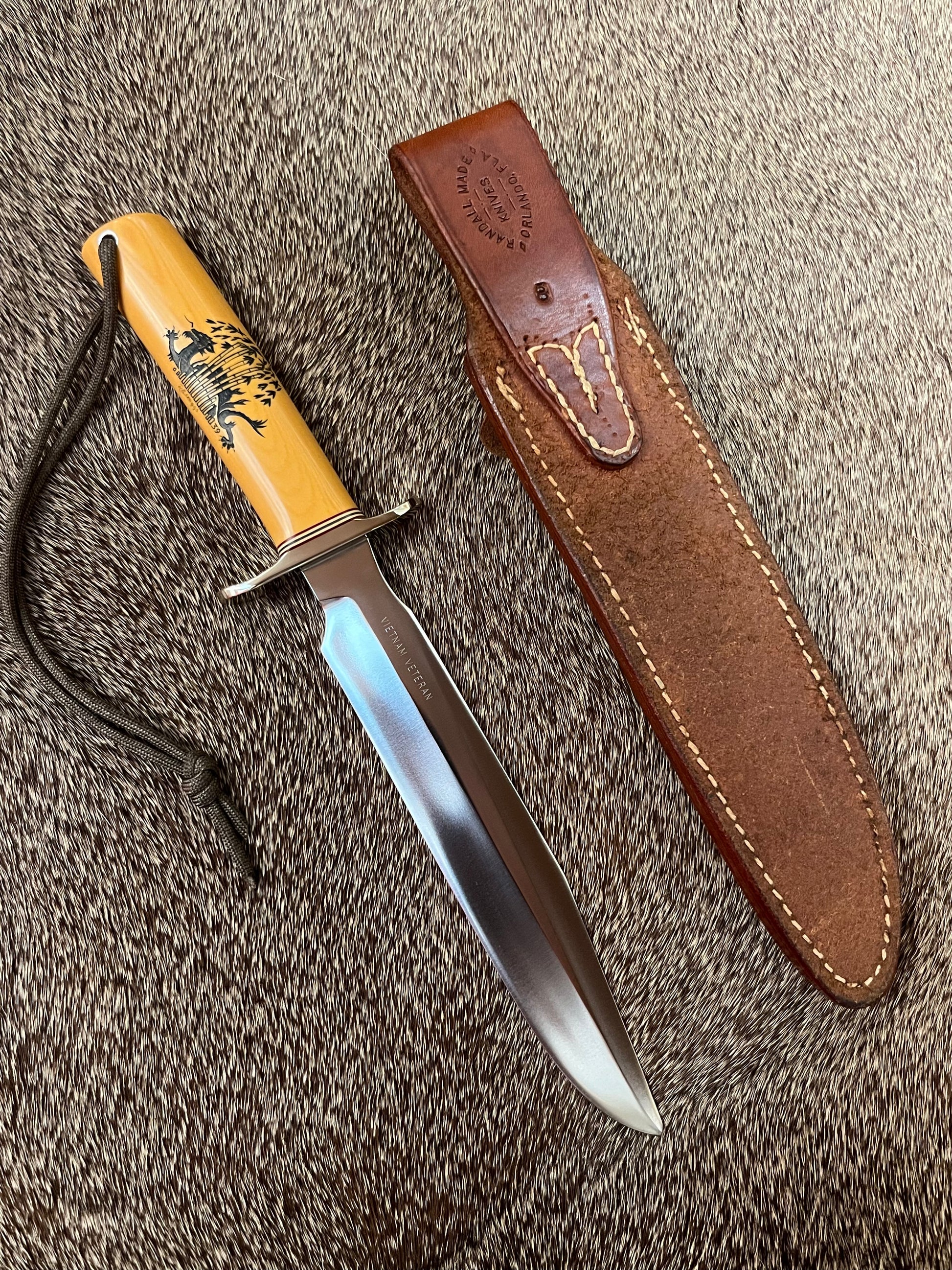 Johnson Rough Back Leather sheath, with Salmon sharpening stone