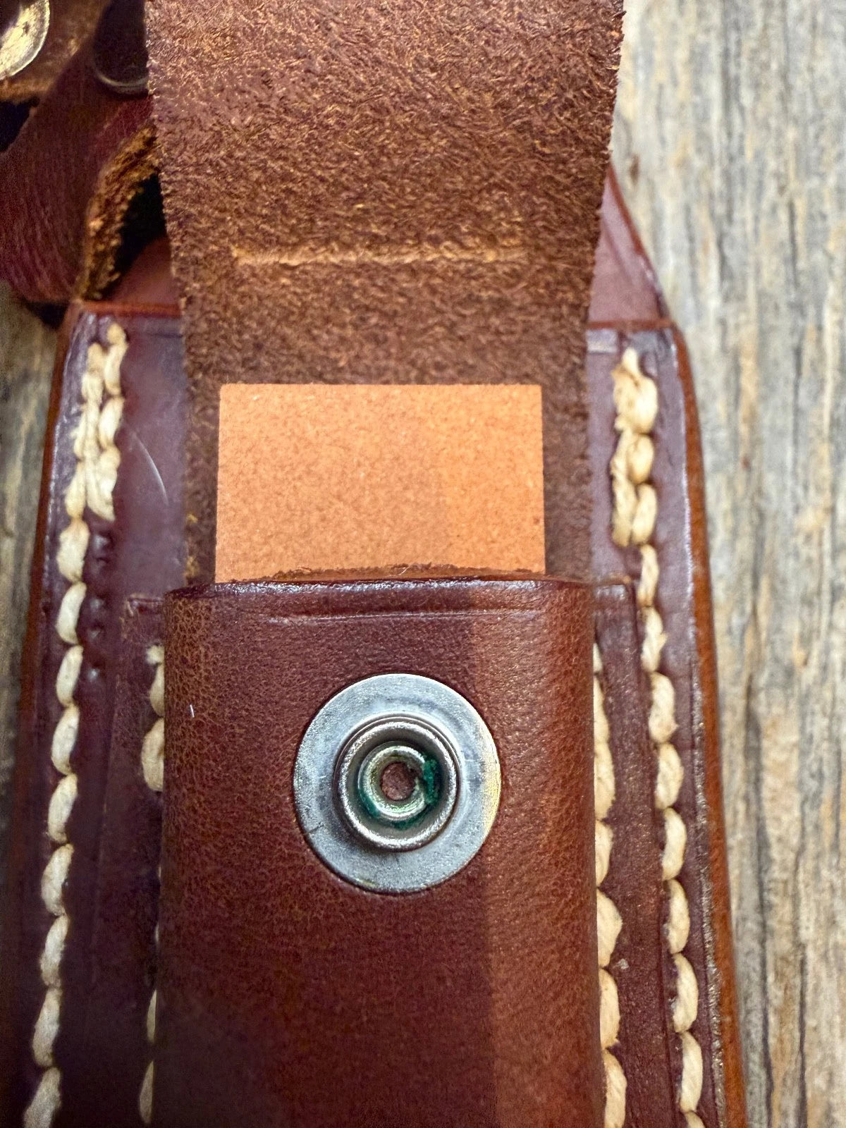 This is not a replacement sheath marked R on the back. Nor is it a second like some of the others I have offered. This is a very nice 1st condition sheath with all the proper stamps, markings, finish and snaps.